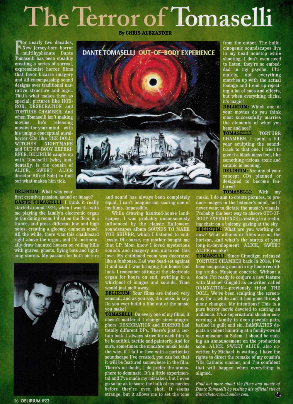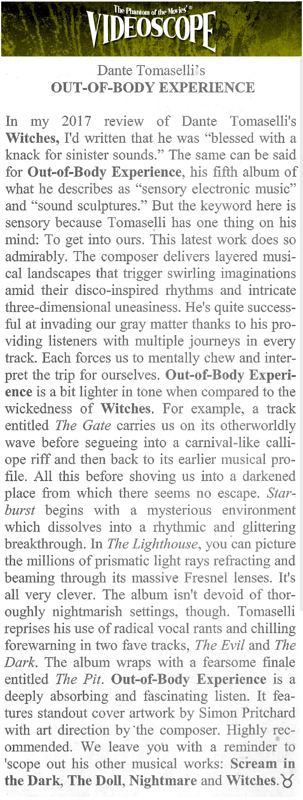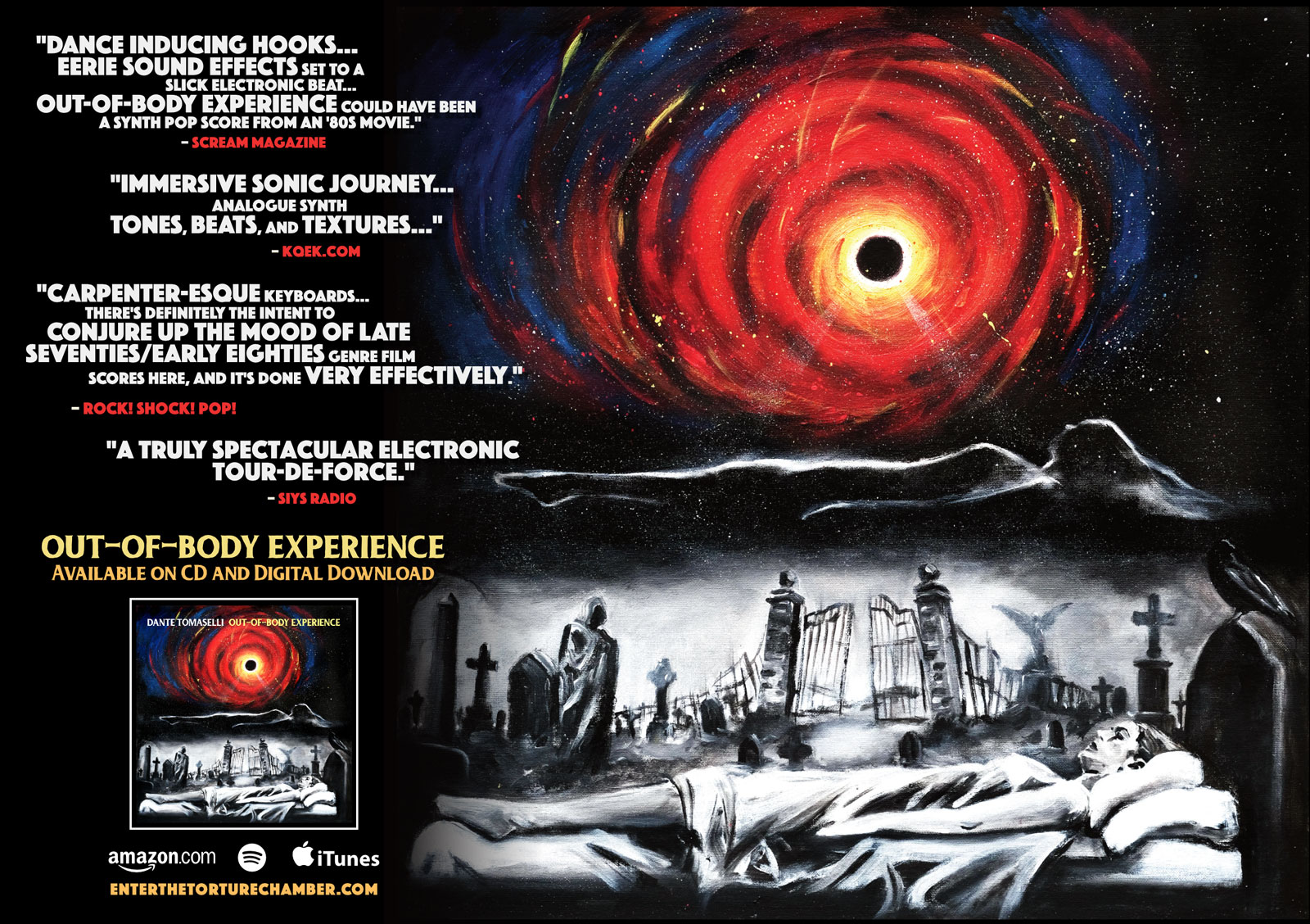 “The multi-talented Dante Tomaselli is a director, writer, producer and score-composer of all things horror and with his latest CD release of electronica titled, Out-of-Body Experience, he detaches your conscious mind from reality and sends it spiraling into an alternate state of scary-sensory ambiance. Fasten your seat belts!”