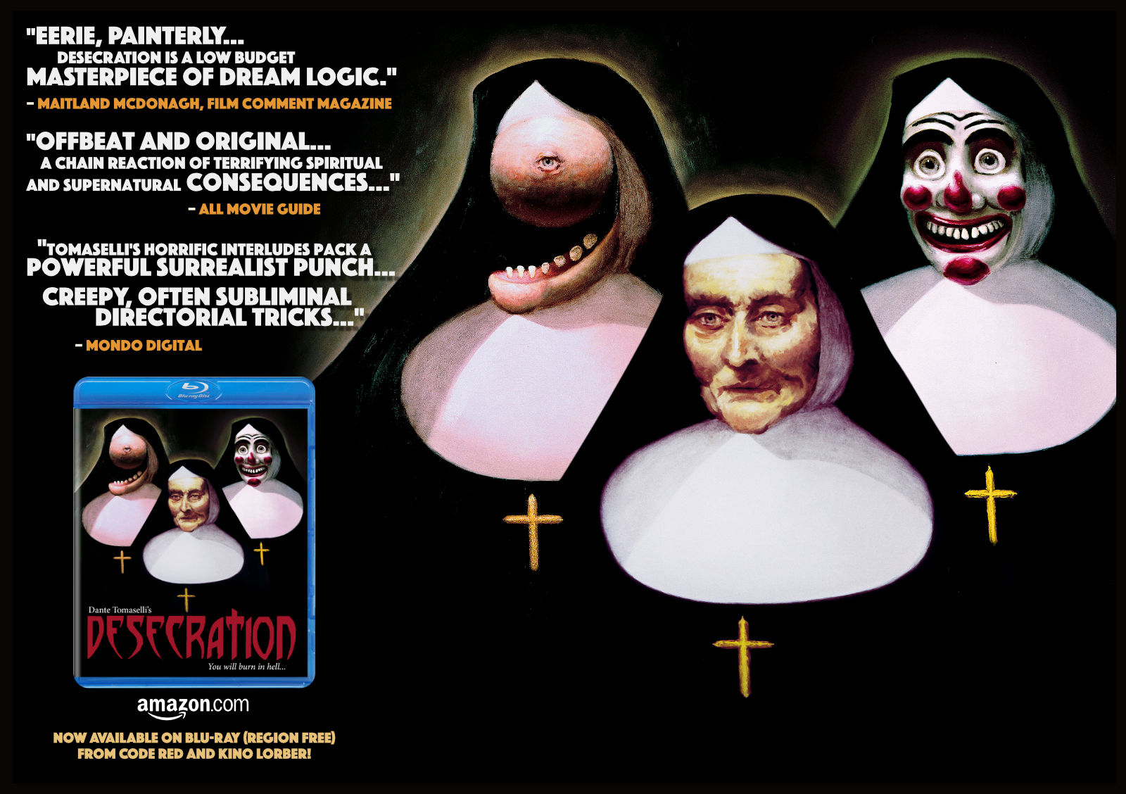 “A wildly ambitious first feature whose lush visuals belie the fact that it was shot on 16mm for a mere $150,000...Paterson NJ-born writer-director Dante Tomaselli first made Desecration as a short film, then expanded the idea into this lavishly imagined feature...An enormously promising debut...Tomaselli's film is sometimes genuinely nightmarish — bloody nuns, killer clowns and a foggy graveyard; what a combination! — and always visually striking, not to mention genuinely creepy...Originality really does count, a lesson lost on many genre filmmakers but which Tomaselli clearly took to heart. Hollywood production designer Alfred Sole, who's thanked in the film's credits, directed and co-wrote the minor horror classic ALICE, SWEET ALICE (1978); he's Tomaselli's cousin, and Tomaselli's father, who owned a bridal store, provided ALICE, SWEET ALICE's communion dresses.”