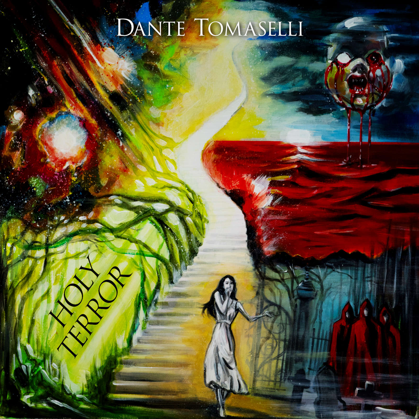 “Incorporating gothic tendencies fused with the surreal use of pop-art colors...Tomaselli mainly utilizes icy blue tones and fluorescent reds in his work, drenching the landscape with an expressionist sense of the macabre. A swirling mist is everpresent, cutting up the landscape, allowing for unknown forces to lurk within the shadows.”