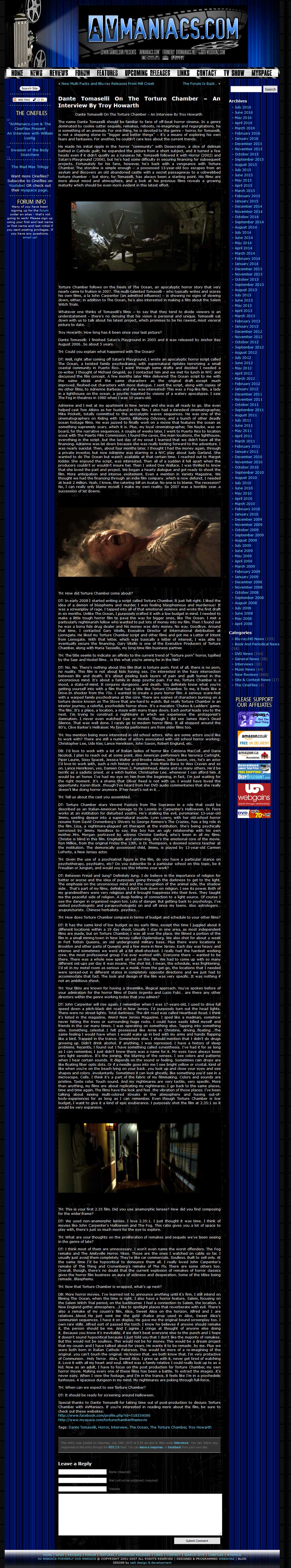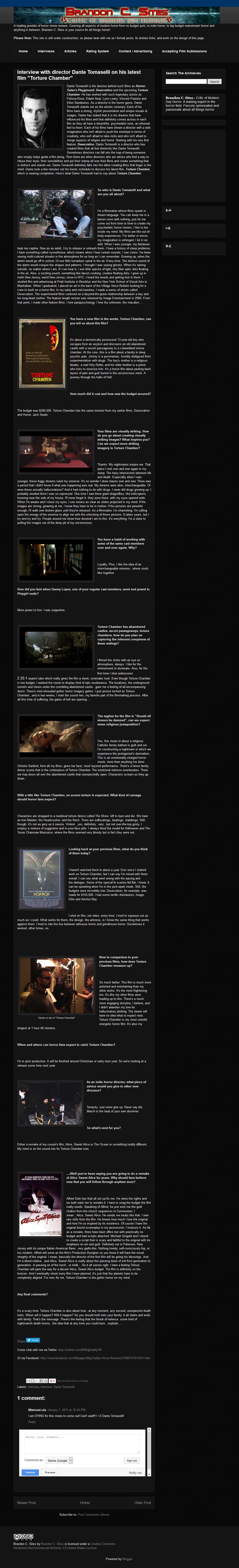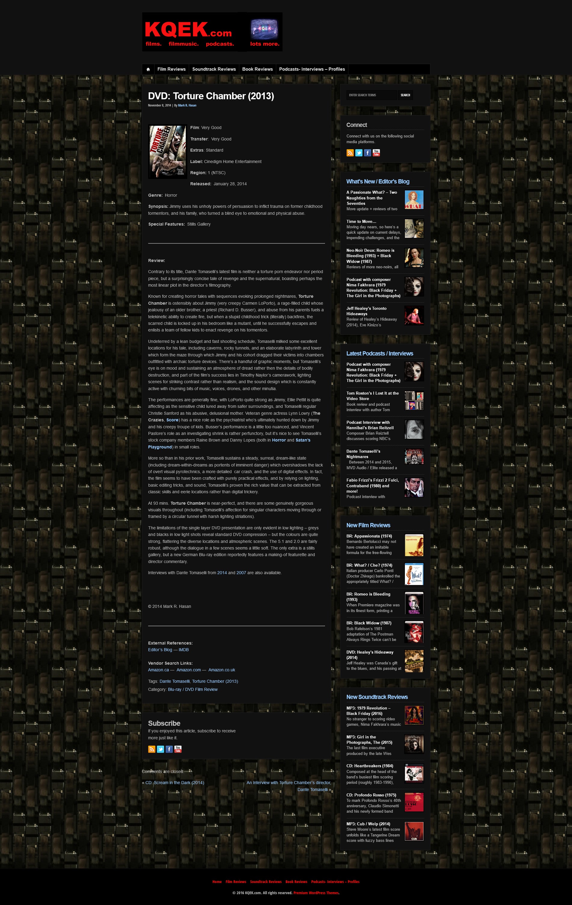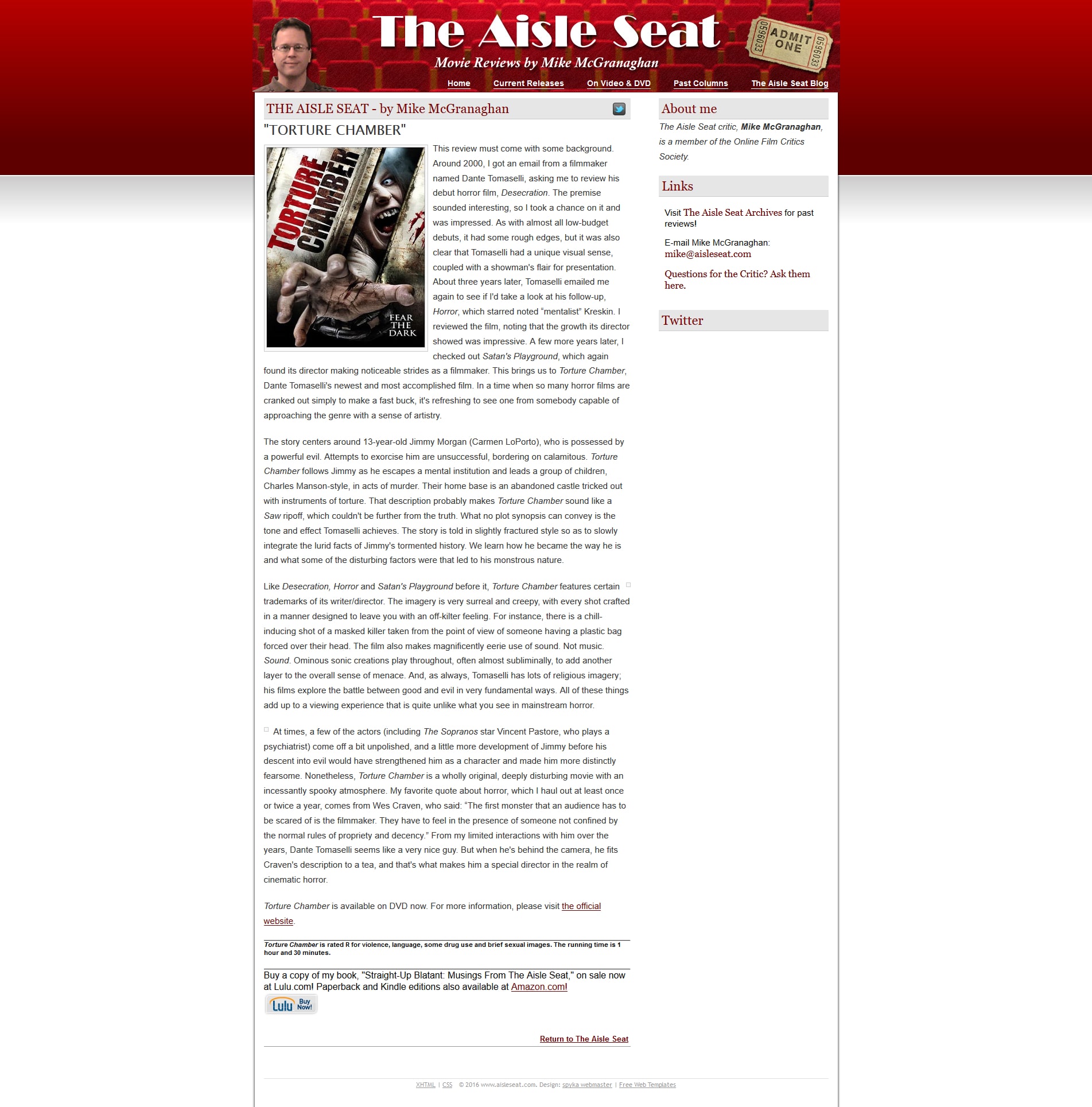 "I firmly believe Dante Tomaselli is one of the most refreshing and daring voices in the world of horror cinema. Those who require a little more from their genre flicks will find something deeply unnerving and downright scary. It’s hard to put your finger on what’s giving you a serious case of the creeps, but that’s part of TORTURE CHAMBER's charm...Dante Tomaselli is a master of his craft, a director who isn’t afraid to punish your senses with uncompromising visuals and a well-crafted, multi-layered sound design."