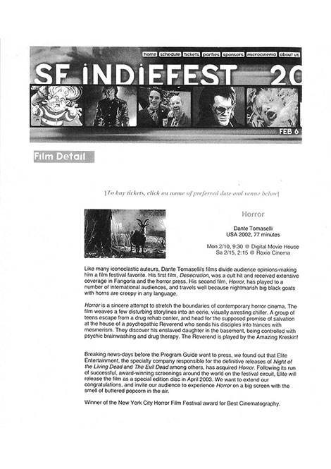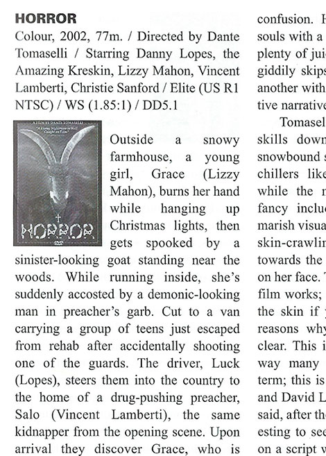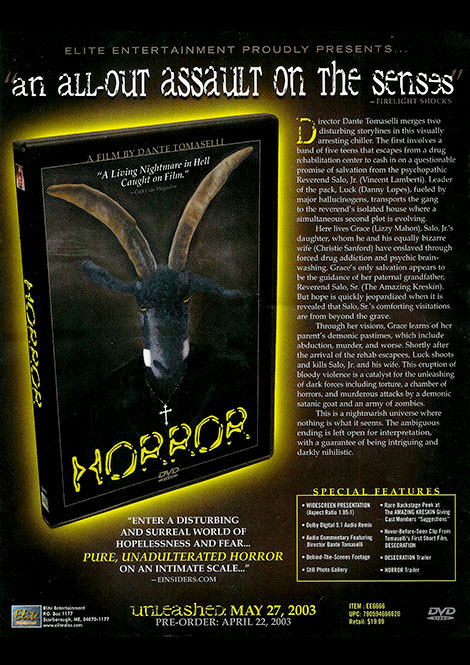 "Gothic surrealism...Horror can't help but impress with its lush, unsettling textural confidence, rich in atmosphere...distinctly ominous..." --Variety Magazine (3/23/2003)
